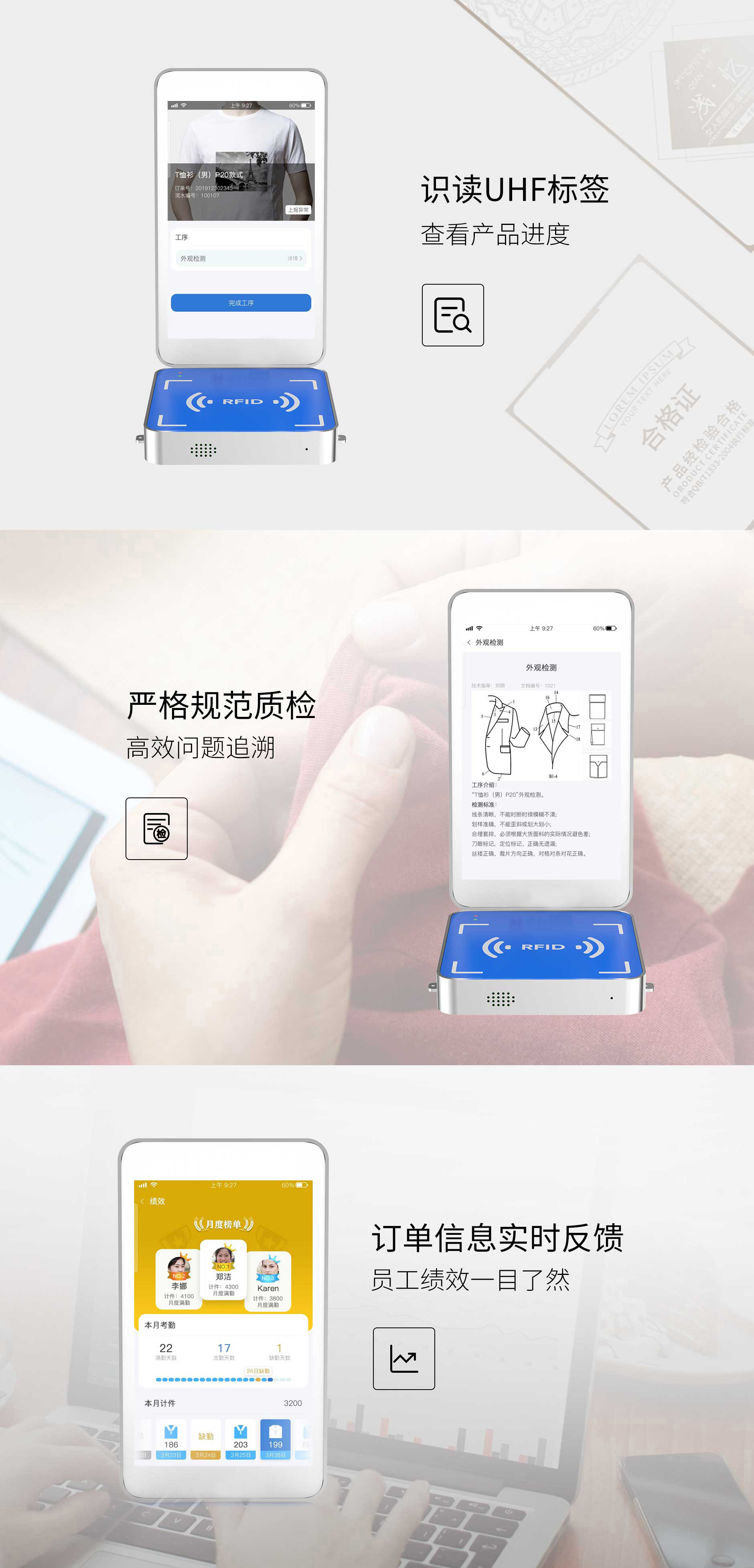 一款针对服装生产任务打造的智能工作平台。8.0寸IPS全面屏,显示清晰,操作便捷。加工、质检、绩效、追溯管理等业务轻松应对。专业超高频RFID模组,快速识别标签信息。完善的SDK,支持二次开发。